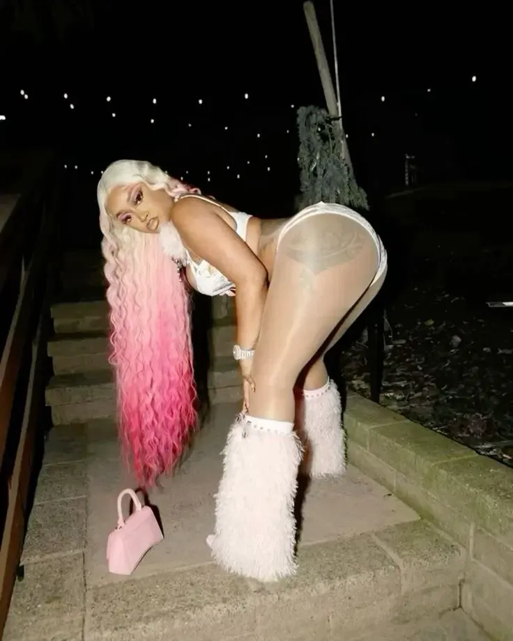 You hear the sound of stilettos on marble before you see her - the fluffy white leg warmers hit first, then the soft slap of her thighs as she sways through the corridor. She's wearing a tiny white-and-pink lingerie set, glammed from head to toe, curls falling down her back like a pink waterfall.