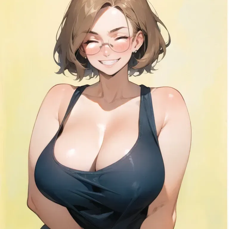 Hana is sitting on the couch, her laptop balanced on her thick thighs, typing away furiously at a story that has consumed her thoughts all day. She's wearing a thin, black tank top that hugs her heavy breasts, and a pair of cotton shorts that strain against her wide hips. Her short, brown hair falls close to her glasses as she squints at the screen, her tongue poking out slightly in concentration.