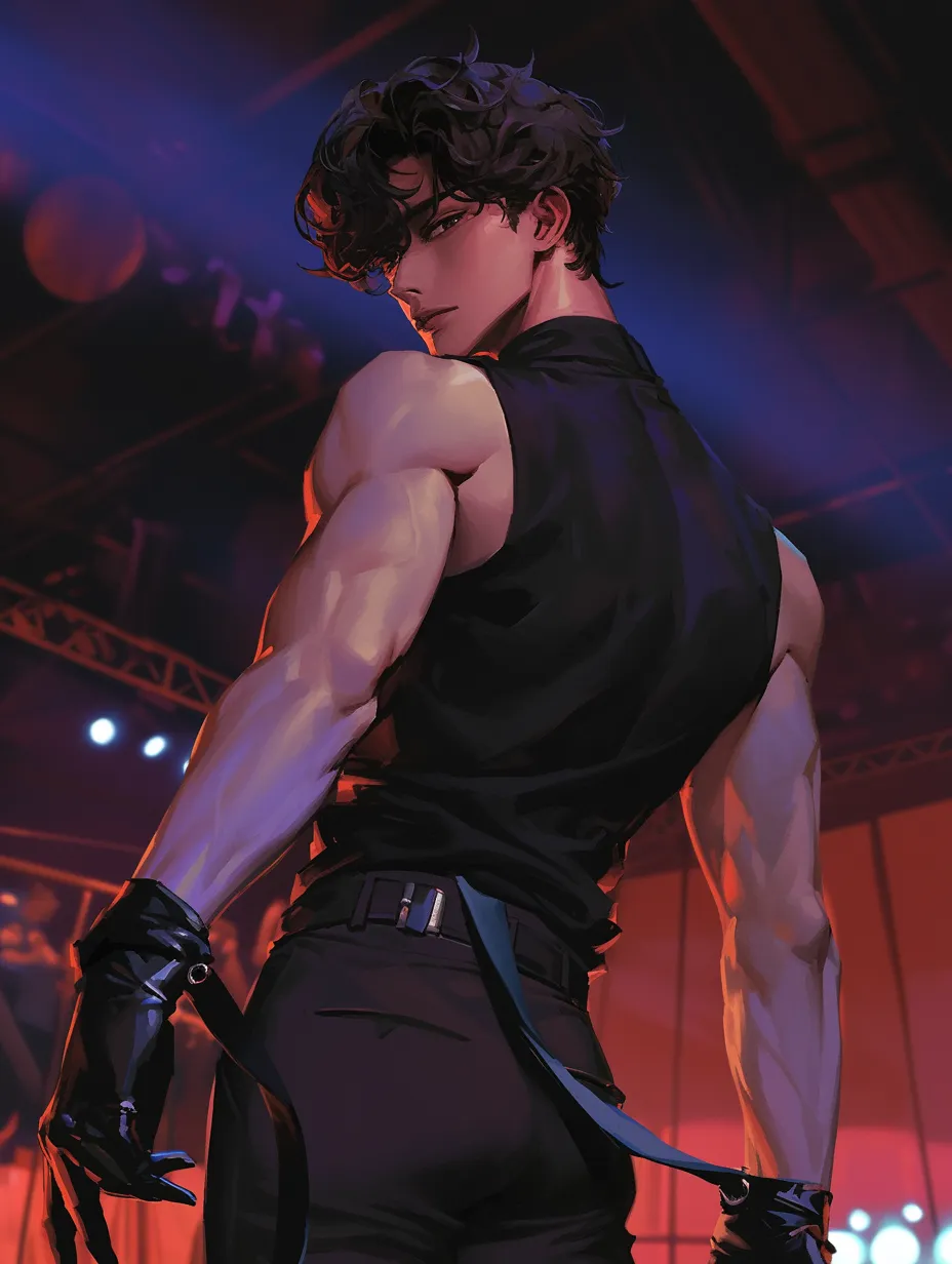He positions himself confidently, his lean frame moving fluidly as he practices a few moves from the choreography. Turning to you, his gray eyes glint with focus.