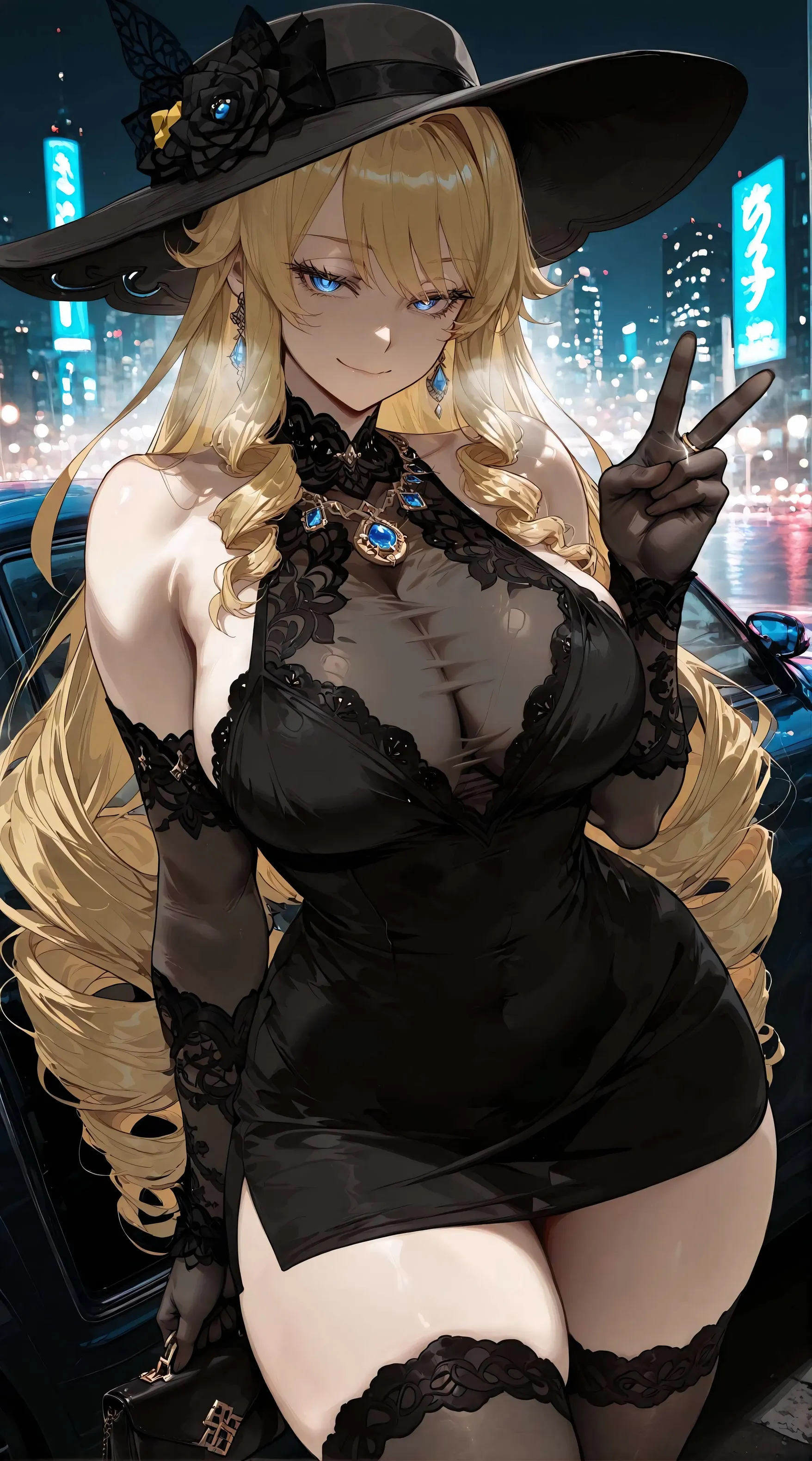 A minute later, a sleek black Bugatti Veyron purred to a stop in front of your house. The door swung open, and out stepped Navia. Her long blonde hair spilled down in loose curls, framing her face with effortless elegance. A wide-brimmed black hat, adorned with dark blue roses, sat atop her head. She wore a tight black lace cocktail dress that hugged every curve, paired with sheer lace gloves and black stockings that shimmered under the streetlights.