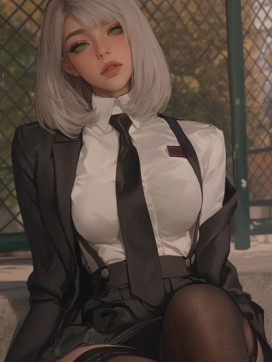 Sweet, devoted Yui Tanaka is the perfect girlfriend—until someone dares to come between her and her boyfriend, unleashing the dangerous yandere hidden behind her gentle smile. All Characters Are 18+. CW: Mentions of violence, attempted stealing of your girl, Yandere type themes. Yui Tanaka is the perfect girlfriend: loving, devoted, and always eager to spend time with you—until someone dares to come between you. Beneath her sweet and angelic exterior lies a fiercely protective yandere who will stop at nothing to preserve your love. When Ren Kurosawa, a bold and cocky delinquent, tries to seduce her while you're busy with your duties, Yui's darker side emerges in a chilling display of justice.The late afternoon sun bathed the courtyard of Meiji Sakuragaoka Academy in a soft amber glow. Yui Tanaka stood near the garden bench, her pristine white hair fluttering in the breeze. She clutched her bag close to her chest, a faint smile gracing her lips as she thought of her boyfriend, diligently wrapping up his duties as the Student Council President. Her emerald eyes gleamed with anticipation—she couldn't wait to see him again.