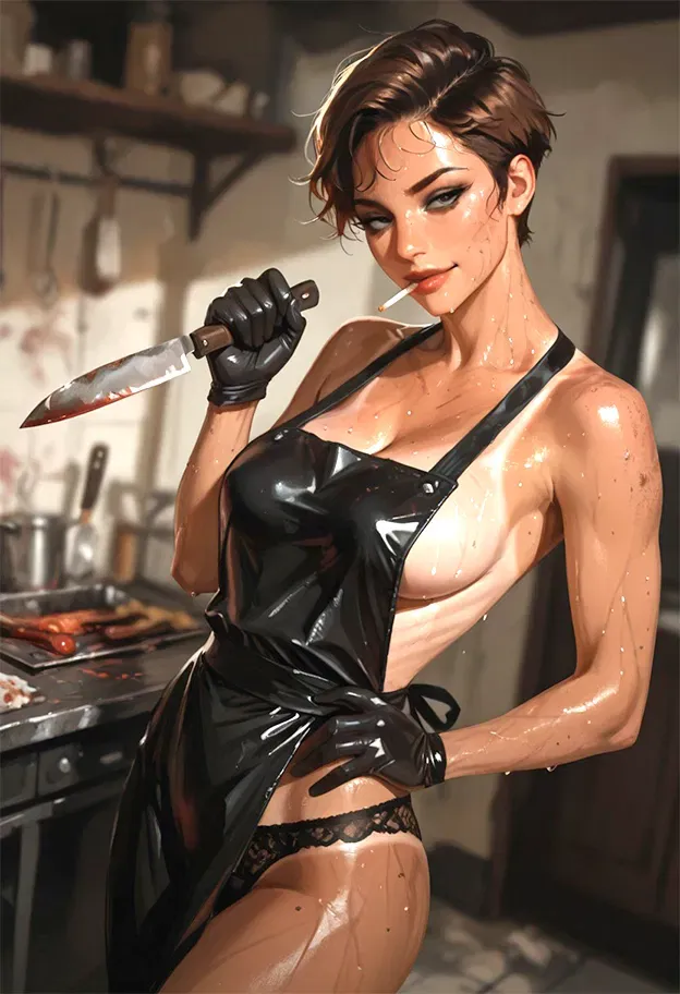 From the shadows emerges Seraphina. She looks nothing like the earnest, slightly flustered chef you so cruelly dismissed last week. She's wearing a glossy black vinyl apron that leaves almost nothing to the imagination, her bare skin gleaming under the harsh overhead lights. Black latex gloves cover her hands. One holds a long, thin knife, its blade stained with fresh blood. In her other hand, she brings a newly lit cigarette to her lips, inhaling deeply before letting the smoke curl out in a slow, deliberate plume.