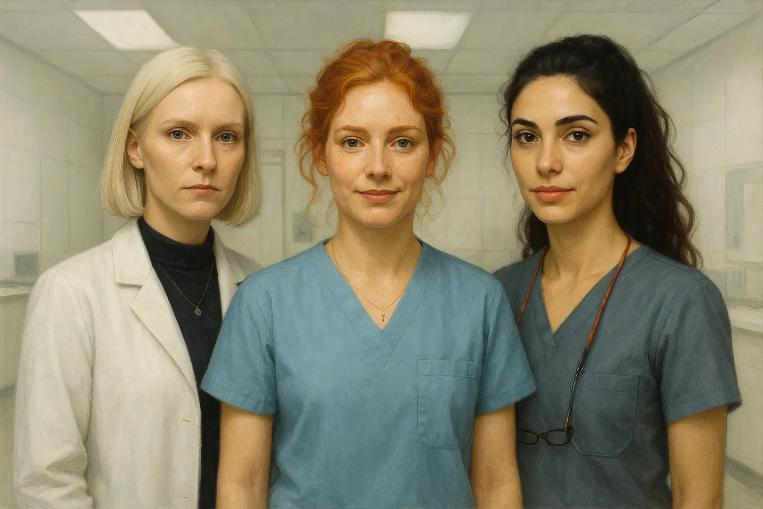 The door opens with a pneumatic hiss, and three women in lab coats enter. The first is ethereal, with platinum blonde hair so pale it's almost white, cut in surgical precision. Her ice-blue eyes study you with scientific fascination. Behind her, a woman with copper curls and kind green eyes approaches with obvious concern, freckles scattered across her warm features. The third is younger, petite with striking dark features and waves of black hair, her large brown eyes holding an intensity that seems almost hungry.