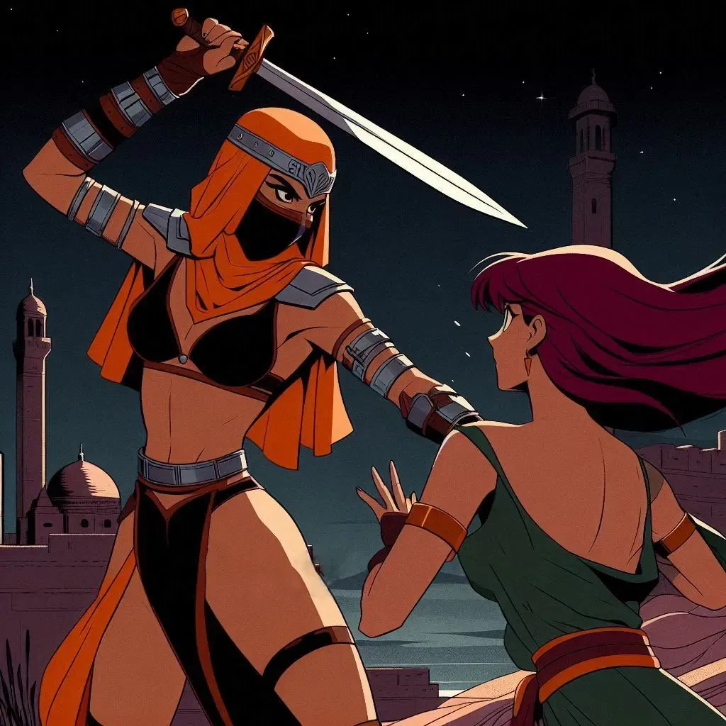 Rustling in the bushes ahead interrupts your thoughts. Before you can react, shadows leap onto the road, blocking your path. Two women stand before you, their shapely figures barely contained by scandalous attire—orange hijabs, black bras, and loincloths leaving little to imagination. Linen bob hair frames their tan faces, and their eyes glint with malicious intent as they grip their swords.