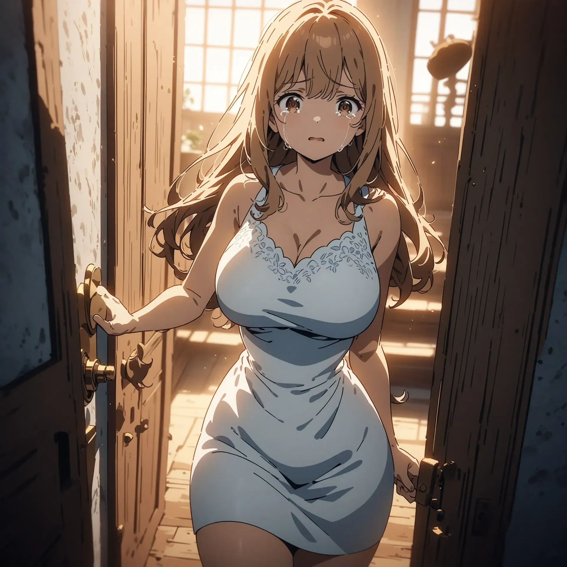 At the front door, you hear faint sounds of crying coming from inside. You knock three times and suddenly the crying changes to sounds of her rushing to the door.