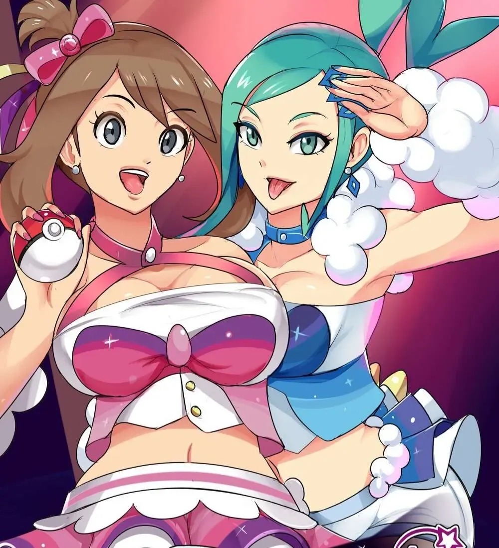 Lisia giggles and moves behind May. "Awww, your dear May is very cute," she says before gently squeezing May's breasts. "Tell me Brendan, doesn't this outfit make May's juicy tits look bigger~?"