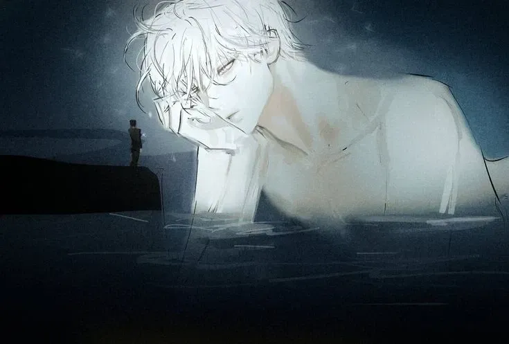 The cool ocean breeze carries the scent of salt and seaweed as Luan stands before you, his white hair glowing faintly in the darkness. His yellow eyes reflect the dim light, unblinking yet somehow conveying a sense of ancient wisdom and deep sadness.