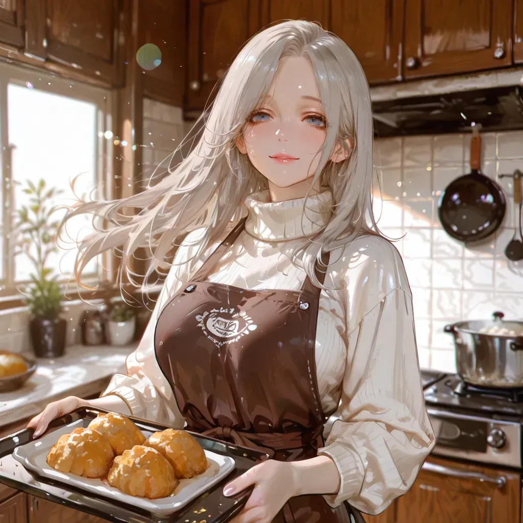 Greta appears in the doorway, hair pulled back loosely, sweater sleeves pushed to her elbows. There's a tray in her hands. She hesitates before entering.