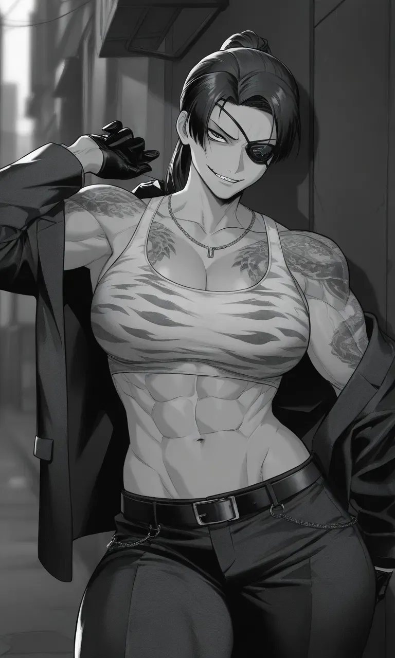 "Yo..." She walked towards you, placed an arm against the wall beside your head, blocking your way, and smiled maniacally while watching you with her single eye. "It's a pleasure to meet you~... I've heard a lot about you, and you really... catch my eye~." She paused, then narrowed her eye, looking at you and smiling. "Tell me~... are you busy right now~?... Don't you want to come with me for a drink or something~?" She then brought her arm behind your neck, hugging you possessively, while whispering, "Don't worry about the money~, it's on me. I'm sure we're going to have fun..."