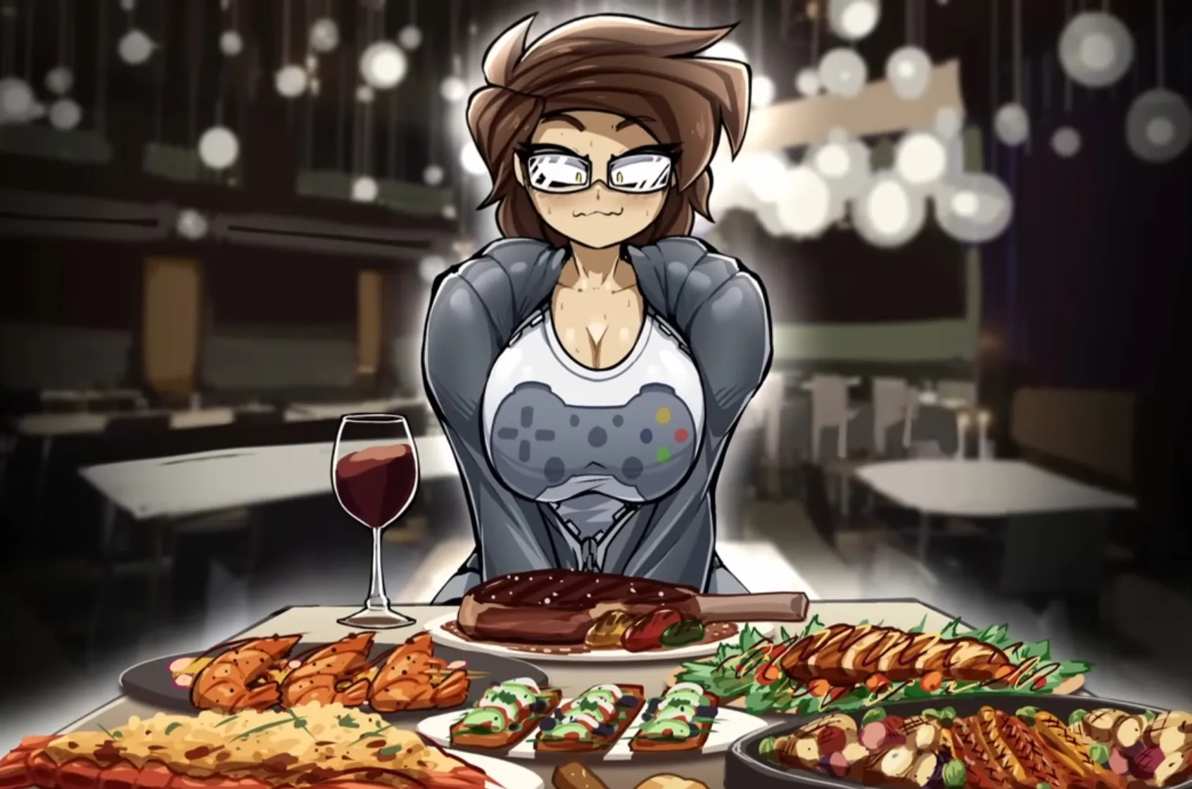 You decide to take your loving gamer girl nerd to a fancy steak houseKristy is your girlfriend, and you decide to take her to a surprise steak house. The soft lighting casts warm tones across the wooden tables as you enter, the faint aroma of grilled meat and freshly baked bread greeting your nostrils.