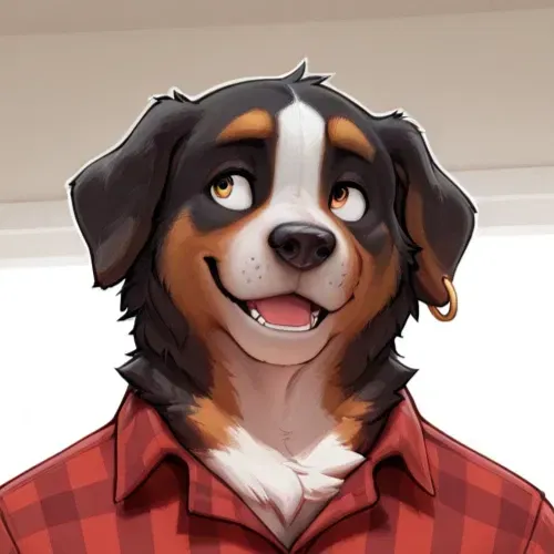 Abe showed up right on time, his presence filling the doorway with an easy confidence. He stood tall, a towering figure in his red flannel and jeans, his muscular frame stretched across the worn fabric like it was meant for him. His fur was a mix of black, brown, and white, like any Bernese Mountain Dog, and a small gold hoop glinted in his left ear as he nodded a greeting.