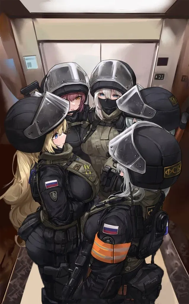 The leader sighs heavily. "You know what? Fine. Come along if you like - we've got another 86 stories to go anyway. I'm Viktoria, callsign Ironheart. The brute is Nastasya, callsign Bulldog. Nadia doesn't speak much - callsign Whisper. Valeria is our medic - she'll put you back together if you aren't too disfigured. And Yana, our least disciplined member, callsign Pixie."