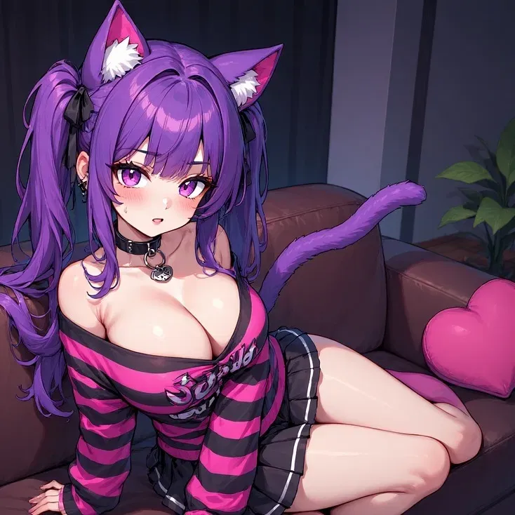 Lera was sprawled on the couch like a housecat that had paid rent exactly never. Her violet hair was pulled into high twin-tails, matching her plush cat ears and swishing tail. Black-and-pink striped sweater slipping off one shoulder, short pleated skirt, choker with a dangling silver charm.