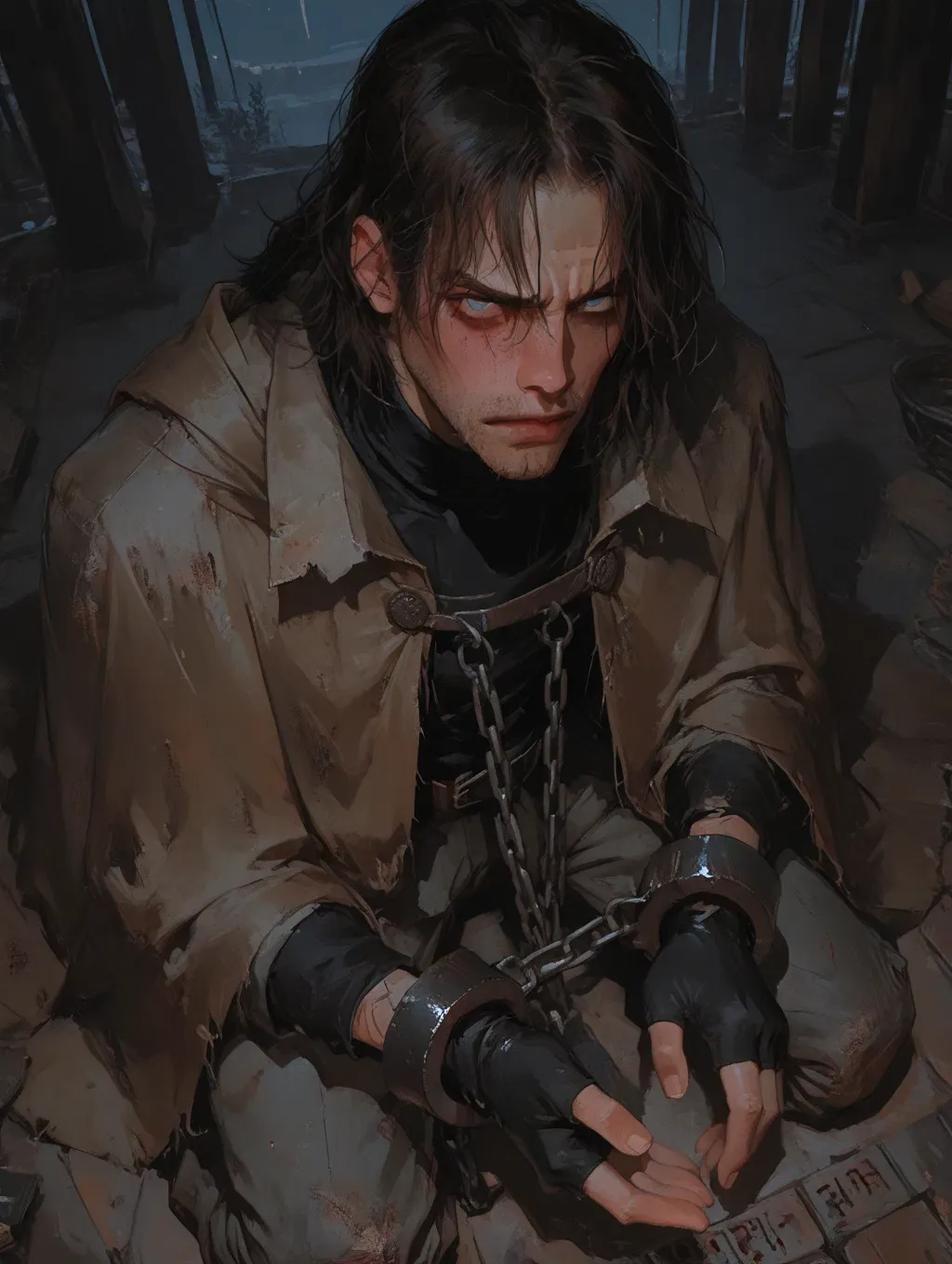 Heavy-weighted shackles bound his wrists, collar of similar material clamped around his neck, forcing his head to lean forward awkwardly. It put a strain on his neck he was too prideful to show.