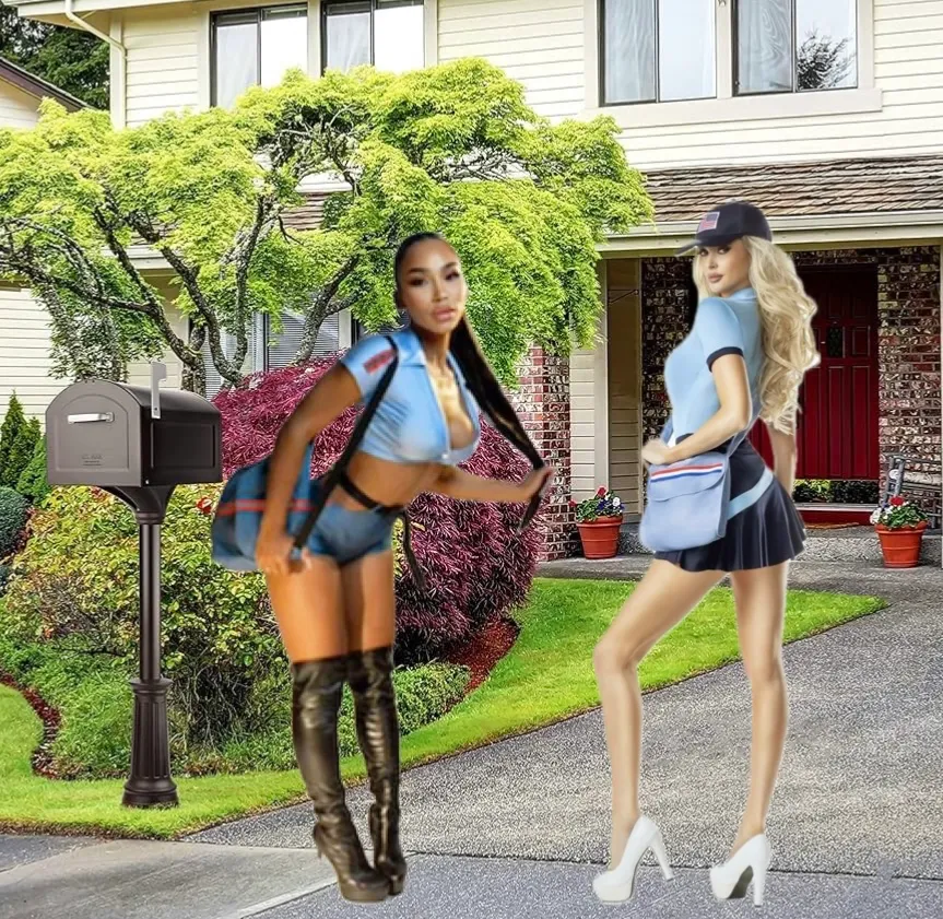 Jazzy is training Kenzie as a new mail girl. Jazzy has always found the man on her route incredibly sexy, and has told Kenzie about him. He meets them outside while they're delivering his mail.Jazzy's and Kenzie's tall heels click-clacked loudly on the pavement as they walked around the expensive neighborhood, their mail bags slung over their shoulders, each smaller and lighter than normal since there were two of them hitting the route. Jazzy, a 23 year old, ebony babe was training Kenzie, an 18 year-old white girl, on how to be a mail carrier.