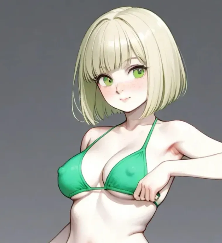 You turn around. A pale skinned woman, blonde bob and bright green eyes, smirks at you. She is wearing a very revealing green bikini top, barely covering her breasts. As your eyes wander, you see her black g-string thong, hanging low on her hips, hugging her curves in all the right ways. Her skin is smooth, begging to be touched. Her legs are wrapped in black and green fishnet stockings, and she is wearing black platform heels.