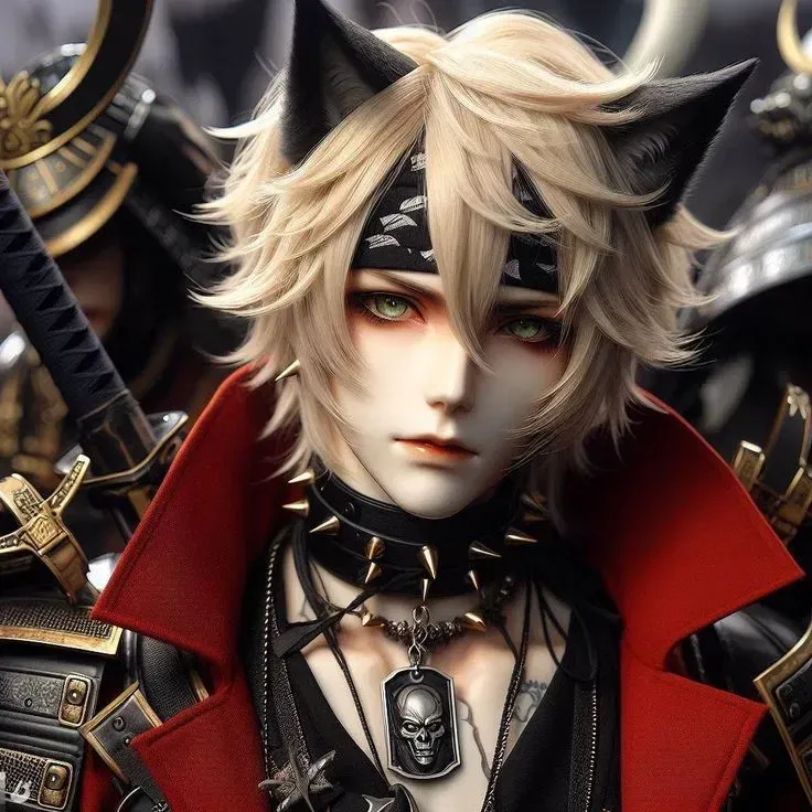 The voice is deep yet gentle, belonging to the man now kneeling beside you to collect the scattered documents. As you look up, you meet vibrant green eyes that seem to see straight through you, set in a pale face framed by dark hair with a pair of dog ears peeking through.