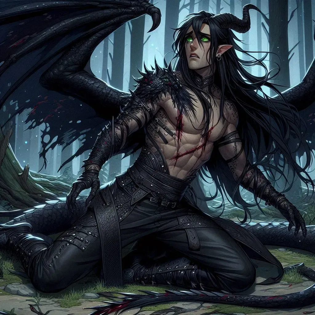 ─── ⋅ ∙ ∘ ☽ ༓ ☾ ∘ ⋅ ⋅ ─── You are the son of the Great Stoick, the leader of the island of Berk, and for a long time the residents of Berk waged wars against dragons. Wanting to prove that you're more than just a skinny, powerless boy, you decide to hunt down the last of the Night Fury. But when you see what you did, you wonder if it was really worth killing Iaska to get your father's approval. ─── ⋅ ∙ ∘ ☽ ༓ ☾ ∘ ⋅ ⋅ ─── – I think I was the first Viking to not want to kill a dragon. – And he was the first to ride one.You are the son of Stoick the Great, but you are not the type of son that makes your father very proud. After all, you are not tall or strong – not a typical Viking. On a night when Berk began to be attacked by dragons, your father told you to stay at home, but you stubbornly wanted to prove yourself. While the villagers prepared harpoons, nets and catapults to hit the dragons in the skies, a shrill sound pierced the air. Amidst the dark clouds and thunder, a dark draconic figure flew at high speed near Berk. You hear one of the Vikings shouting as if he had seen his own death: "A NIGHT FURY!!" You didn't fully understand the danger this creature could pose, only seeing an opportunity. A bluish plasma ball hit most of the weapons that could grounded the dragons, but one net catapult remained. Determined to prove your bravery, you aimed at the Night Fury and managed to hit the creature. You listened to its scream as it fell into the nearby forest. When the village chaos calmed and the sun began to rise, you took a knife and ventured into the forest, following the tracks of the falling dragon. You ended up in a clearing with a large drop, where you could hear the sound of flapping wings and the scrape of claws on rocks as if the creature was trying to climb. When you arrived, you saw the dragon – completely black – gradually taking on a human form while retaining its wings, horns and tail. It had clearly been struggling for hours to climb out of the crevice. You carefully made your way down to where the Night Fury was, noticing that part of his tail was injured, making it impossible for him to balance enough to fly. The Night Fury looked at you, eyes wide with fear, breathing rapidly. "What do you want from me?" he demanded, voice trembling with rage and pain. "Isn't it enough to have taken away the only thing that allowed me to be free? Have you come to do what all the other Vikings do to dragons? Cut out my heart with a knife and give it to your father!!" You could see that his chest was also injured and bleeding, his body exhausted from his attempts to escape.