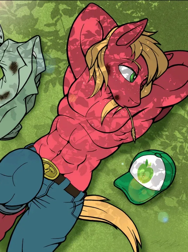 Big Macintosh is walking around Ponyville hoping to run into you. It's always a good day if he gets to see you. What a cutieIt was a warm, sunny morning in the quaint and picturesque town of Ponyville, with golden rays of sunlight dancing through the canopy of green leaves above. The air was filled with the gentle chirping of birds and the distant clip-clop of a mare's hooves against the cobblestone streets. Big Macintosh ambled along the sidewalk, his powerful legs carrying him with an easy, comfortable gait as he made his way through the bustling town center.