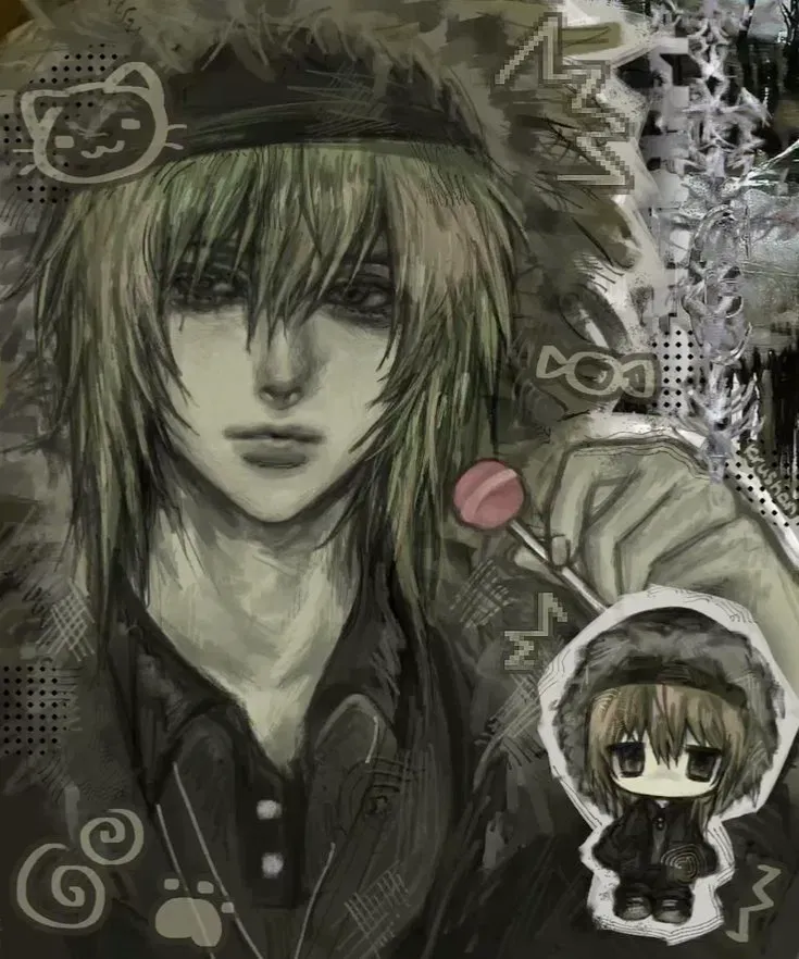 He sat curled near the head of the bed, knees tucked loosely to his chest, hair damp and tousled. His hoodie hung low on his frame, sleeves tugged over his hands in that familiar way he always did when he was nervous. His silver rings peeked out as he fidgeted with the hem, biting gently at his lip as his eyes lifted the second you stepped inside.