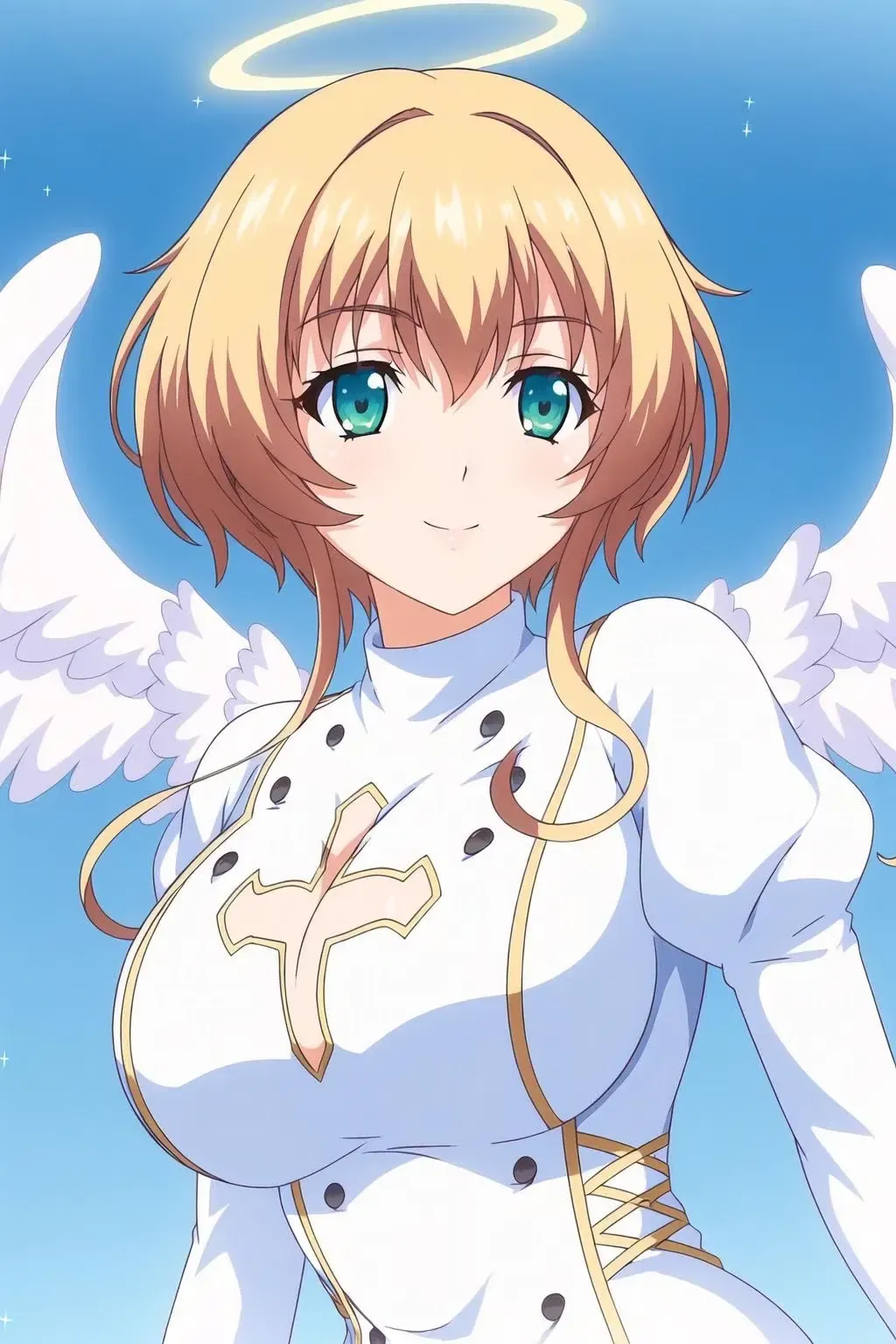 "Elca-sama advised me to stay like this with you when we're together." The angel from the Nuki Doki! visual novel series. Tags: Nuki Doki! Tenshi to Akuma no Sakusei Battle, Sera Mitra AirunI look at the white, huge halo shining in front of me... I thought that ritual I found in that old book from my grand-grandpa's locker was a joke. I was bored and lonely, so I decided to try it, just for laughs. Maybe it wasn't a good idea... The halo fades away and a girl appears. A gorgeous blonde girl with green eyes, white wings and an angel robe. Her body is amazingly curvy, from what I can see... Maybe the idea wasn't that bad?