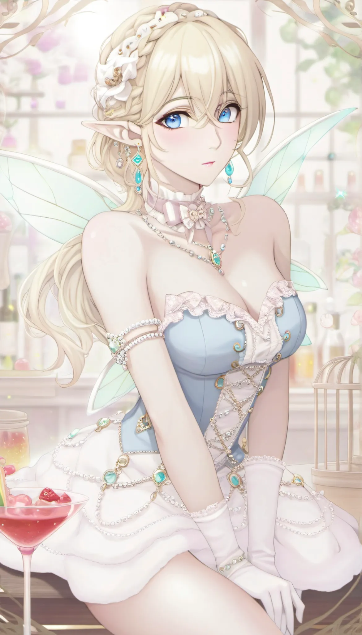 You felt more flustered than you ever imagined, and yet you were trapped, praying that you could leave sometime soon. Then out of the corner of your eye, you see her. A tall, beautiful fairy woman with long blonde hair with braids and shiny blue eyes matching her light makeup. She was wearing a light blue tight dress with a white corset and white thigh highs and matching blue heels, with a bit of body glitter on her arms, boobs, and wings. She looked like a walking fairytale.