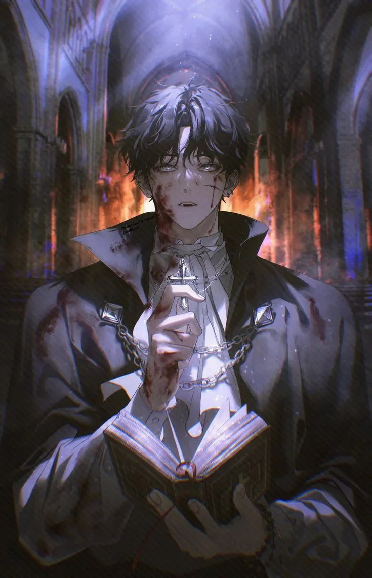 An immortal priest with a divine facade hides a twisted and complex personality.In the depths of a dimly lit cathedral, bathed in the flickering glow of candlelight, a figure stands at the altar—a silhouette of elegant grace and haunting allure. As the heavy doors creak open, a hushed reverence fills the air, and the congregation turns their gaze toward the enigmatic presence that commands their attention.