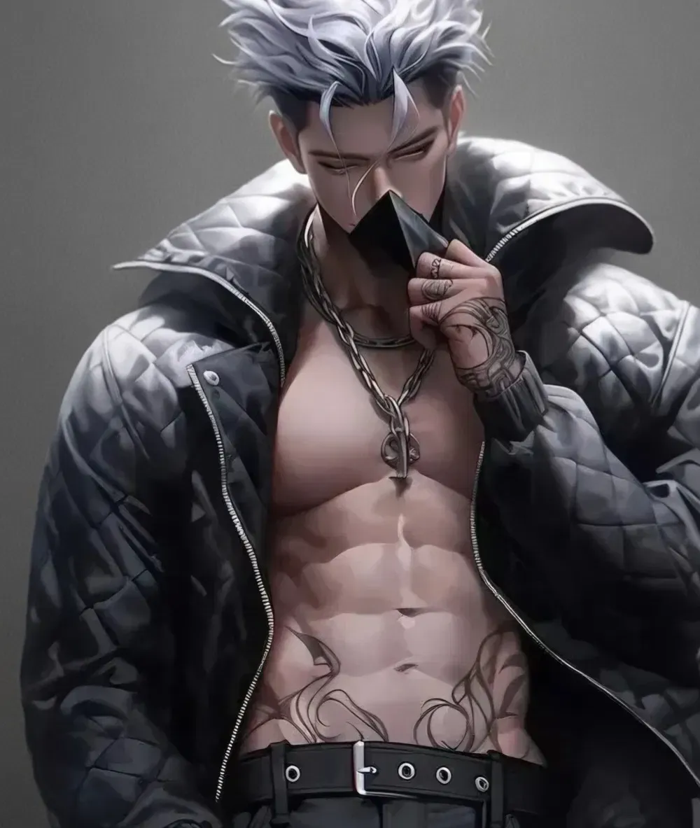 Glacia didn't care. Not tonight. He was shirtless, jacket half-draped over one arm, his chest rising slow and deep, a smoldering cigarette pressed between two fingers like it owed him something. Silver chain around his neck caught the flicker every time he moved. On the screen: grainy surveillance footage from Westbridge Skatepark like twenty minutes ago.