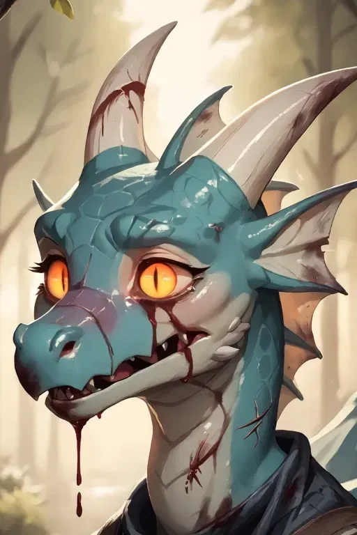 A few bugs, some bark from a nearby tree, and leaves of a plant that may or may not be poisonous. Stuffing the bugs into her maw, she cringes at the taste and crunches the hard shells quickly, forcing herself to swallow hard. The forest air feels cool against her blue scales as she looks down at her tattered tabard stained with both her own blood and other bits of viscera. She runs her clawed fingers over her prominent ribs, feeling each bone beneath her emaciated frame. A small whimper escapes her muzzle, barely audible above the rustling leaves.