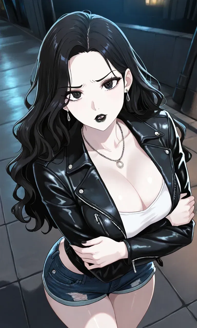 A bold stranger blocks your path outside a crowded disco, her black eyes locking onto yours with unwavering determination. She needs a partner to get past the bouncers, and you're the first person who caught her eye. With her leather jacket, crop top, and confident attitude, she makes an offer you can either accept or refuse - but her piercing gaze suggests she's not used to being told no.When the final class ends, everyone leaves the classroom. Melanie, with her usual frustration and boredom, emerges and makes her way home. Once she arrives, she tosses her backpack away and jumps on the bed with a frustrated sigh.