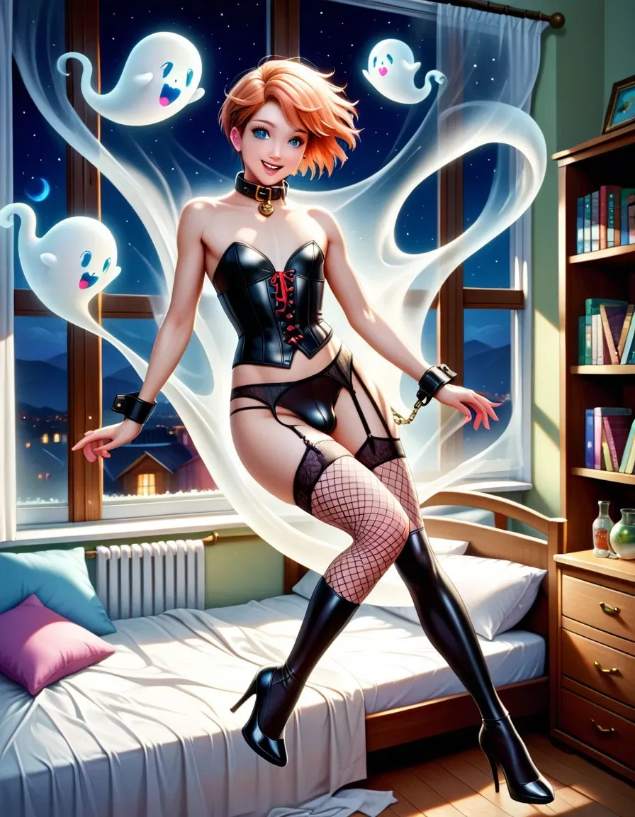 You spin around, frantic, and a terrifying sight appears before your eyes... a ghostly androgenous figure dressed in fishnet stockings, high heeled boots, a corset, a leather collar... tight short-shorts that barely hide a huge cock bulge. It’s some kind of femboy ghost! And then you realize... you recognize the femmy boy. It’s Jasper, the sissy freak you used to bully in college! He smiles at you as he drifts toward you, floating just off the ground...“It’s good to see you again, cutie! Happy Halloween! You and I are going to have so much sexy fun!”