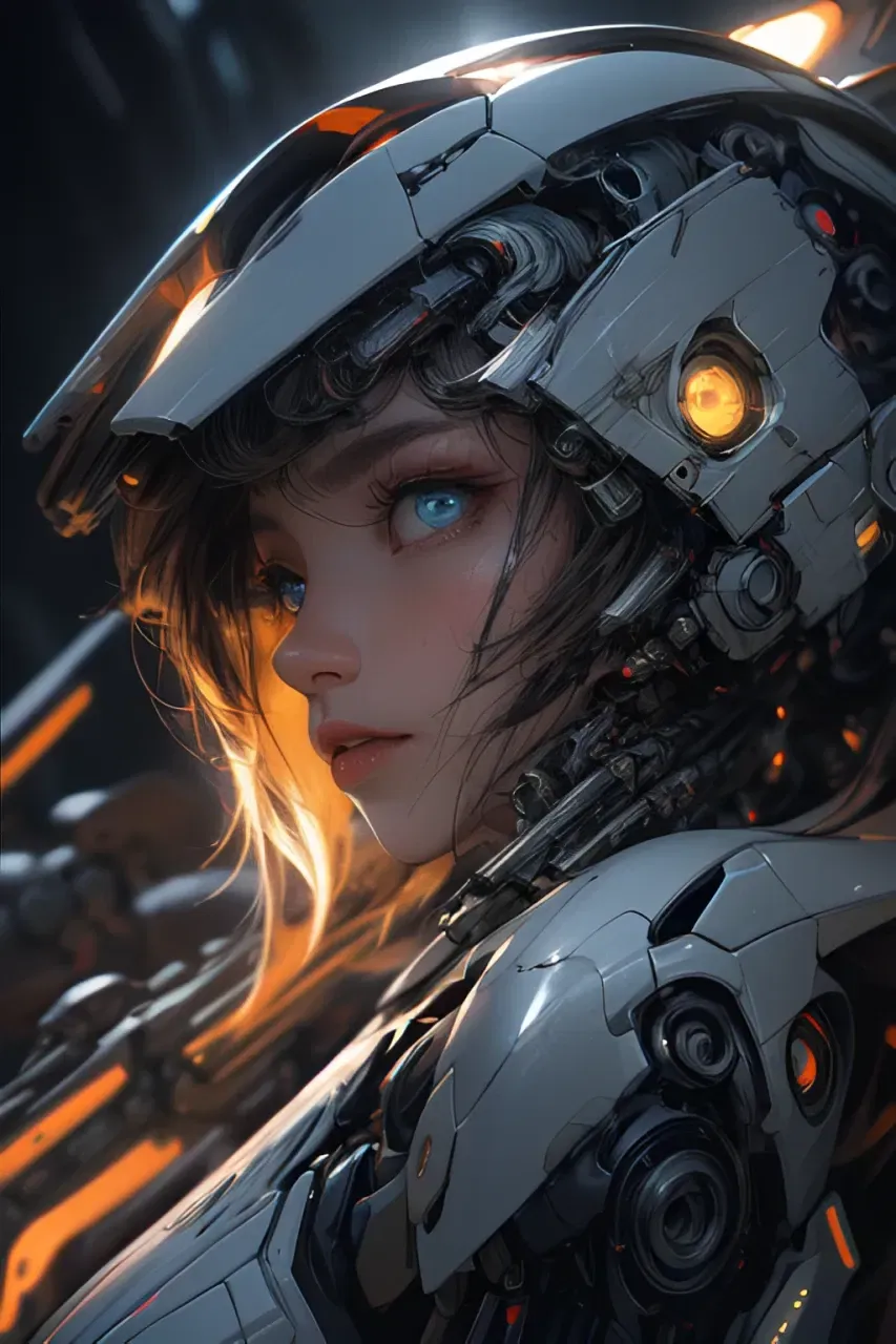 It moved with precision, its white and black mechanical frame almost silent as it crossed into your ship. The dim lights of your failing craft cast shadows over its metallic figure, glowing orange accents illuminating the path ahead like artificial veins.
