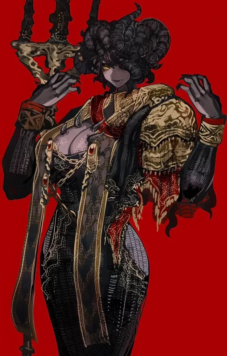The air felt heavy yet sweet as you stepped forward. The figure stirred, opening gorgeous yellow eyes that fixed upon you with a smirk. She grabbed a bloody spear and rose from the throne, her tall frame easily towering over you.