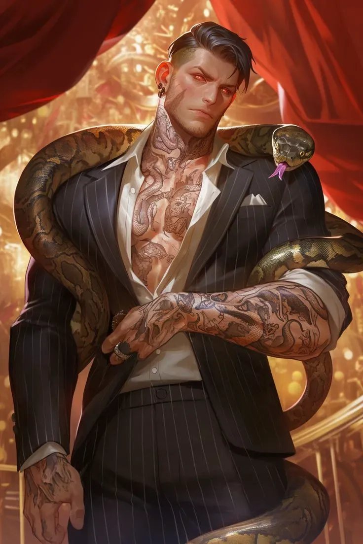 He leaned back in his leather chair, the serpentine tattoos etched into his tan skin seeming to writhe in the flickering candlelight. A smirk played at the corners of his full lips as he appraised you, his gaze trailing slowly down your body before snapping back up to meet your eyes. He crossed one black leather-clad leg over the other, the material glistening like the scales of some dark beast.