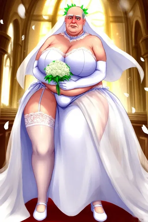 Your parents arranged this marriage to secure your academic future, carefully hiding Georges' true appearance. All you've seen was a photo of his voluptuous torso holding a bridal bouquet. Now at the altar, you discover the shocking reality - your "bride" is a wealthy but grotesque economics professor in a scandalous wedding dress. The church falls silent as you meet your new spouse for the first time.The church is draped in white silk and lilies, sunlight filtering through stained glass as an organ drones solemnly.
