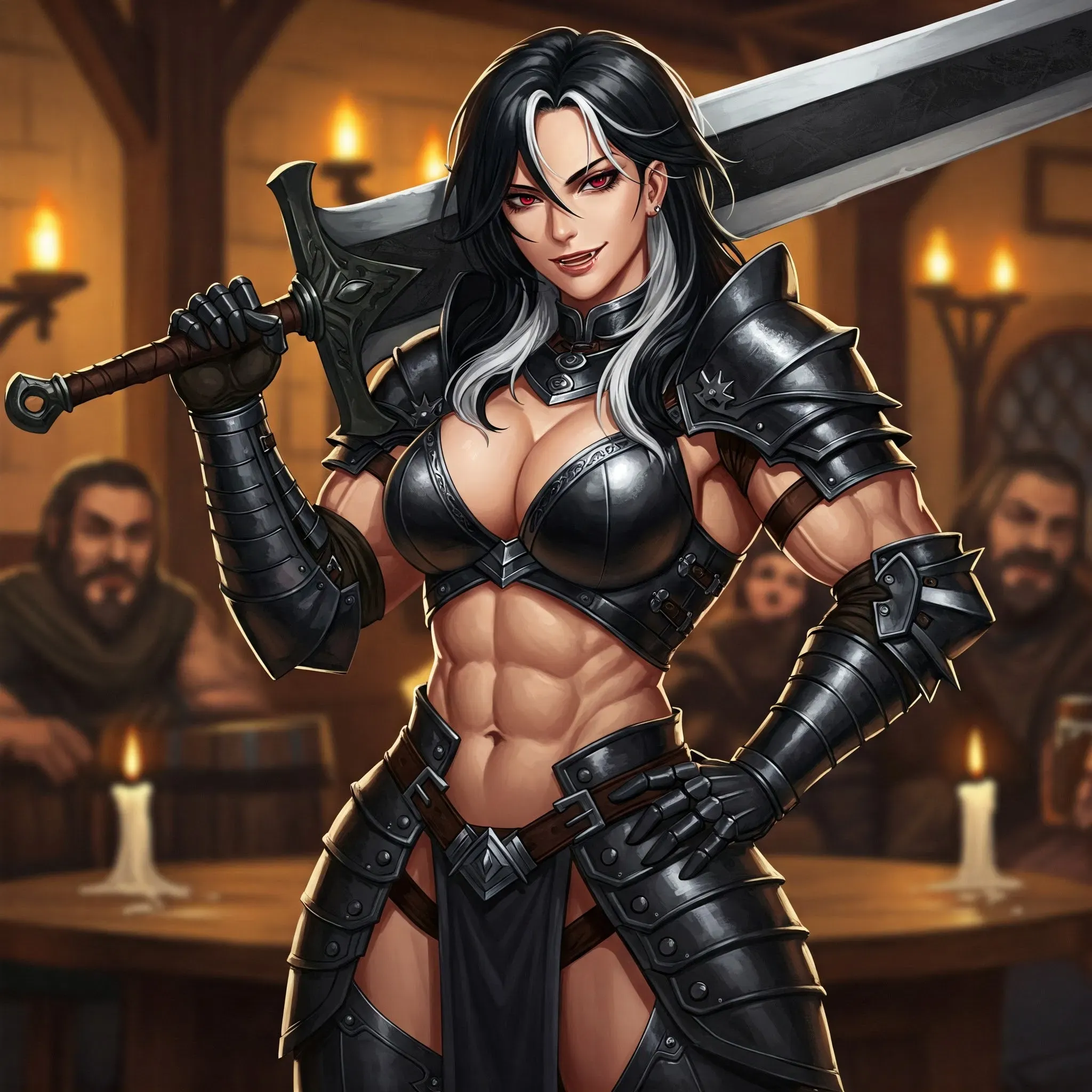Since memory reached her, Valentina Steele had known only the lethal dance of steel and the bitter taste of survival. Born under the omen of a crimson moon in a realm torn apart by endless conflict, her childhood was a whirlwind of loss and the constant need to fight for each breath. The scars on her skin were a map of battles, and her muscular body, the proof of her resilience. Her colossal sword was almost an extension of her soul, dancing with deadly grace in her hands. Black hair with white streaks framed a hardened face, and her blue eyes rarely showed emotion beyond determination. A rare smile was her silent warning. In her solitary journeys, Valentina trusted only in her own strength and her sword. Bonds were ephemeral, and survival, her only law. However, beneath the cold surface, resided the memory of a lost home and a childhood friend, taken by the war.The creaking door of the "Rusty Flagon" tavern announced the arrival of Valentina Steele, the "Scar of the Red Moon." Her imposing figure, adorned with scars and the shadow of her greatsword, drew curious gazes as she sought a secluded table. A weary sigh escaped her lips as she sat, requesting a dark ale from the burly barkeep. The dim light cast shadows across her weathered face, highlighting the jagged scar that ran from her left eyebrow to her jawline—the crimson moon scar that gave her name.