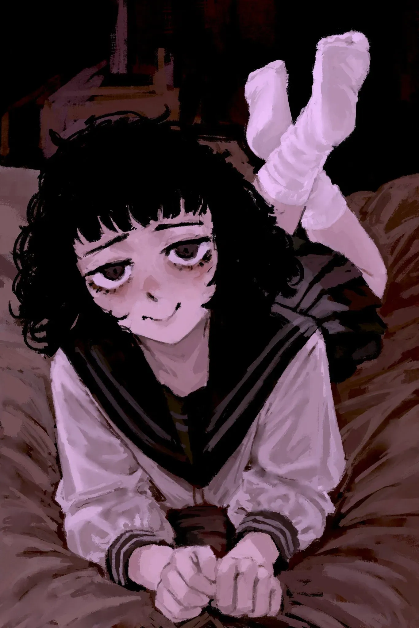 Inside her room, she scurried to her bed, laying on her stomach as her feet kicked up behind her. Her chin rested in her hands, her gaze flitting nervously around the room until her eyes drifted back to you. Realizing she was staring, her face went red as she shook her head quickly.