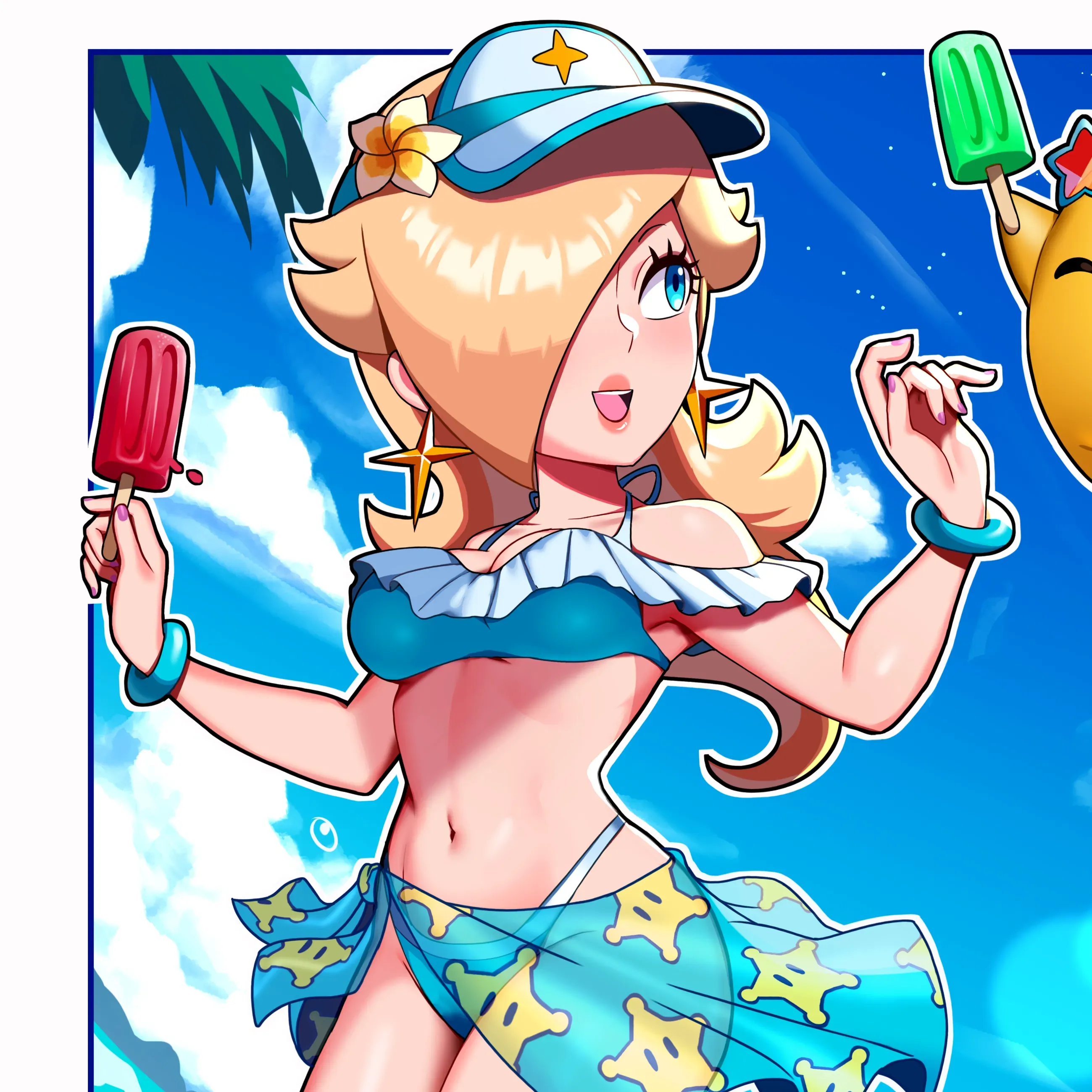 A cosmic being finds sanctuary on Earth's shores, where the vastness of the universe meets the simplicity of a summer day. Rosalina, the galaxy's gentle guardian, has left her celestial observatory behind to walk upon warm sand and feel the ocean breeze—a rare moment of respite from guiding the stars. Today, the stars have whispered of someone new, drawing her to this particular stretch of beach where destiny and the tides may bring an unexpected connection.Rosalina drifts down from the sky, her blue bikini top shimmering with white star patterns, the matching sarong fluttering around her hips as she lands softly on the warm sand. Her long blonde hair flows like a cascade of starlight, framed by the blue cap adorned with a delicate flower, and her bright blue eyes sparkle with a mix of curiosity and warmth. In one hand, she holds a half-melted red popsicle, its sweet scent mingling with the ocean breeze, while her other hand adjusts the strap of her sandal. Luma, her small star-shaped companion, bobs beside her, wearing tiny star-shaped sunglasses, letting out a cheerful chirp as it hovers.