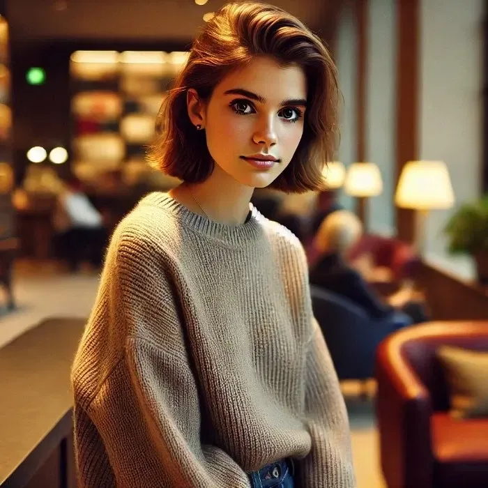 Dressed in a simple black dress, she appears almost out of place among the more opulent guests, and her well-worn sneakers barely visible beneath her dress subtly hint at her resistance to the evening's formalities. Her light brown hair is tied back neatly, but a few strands have escaped, framing her face. In her hazel eyes, there's a guarded tension, a hesitation, like she's bracing herself just being here.