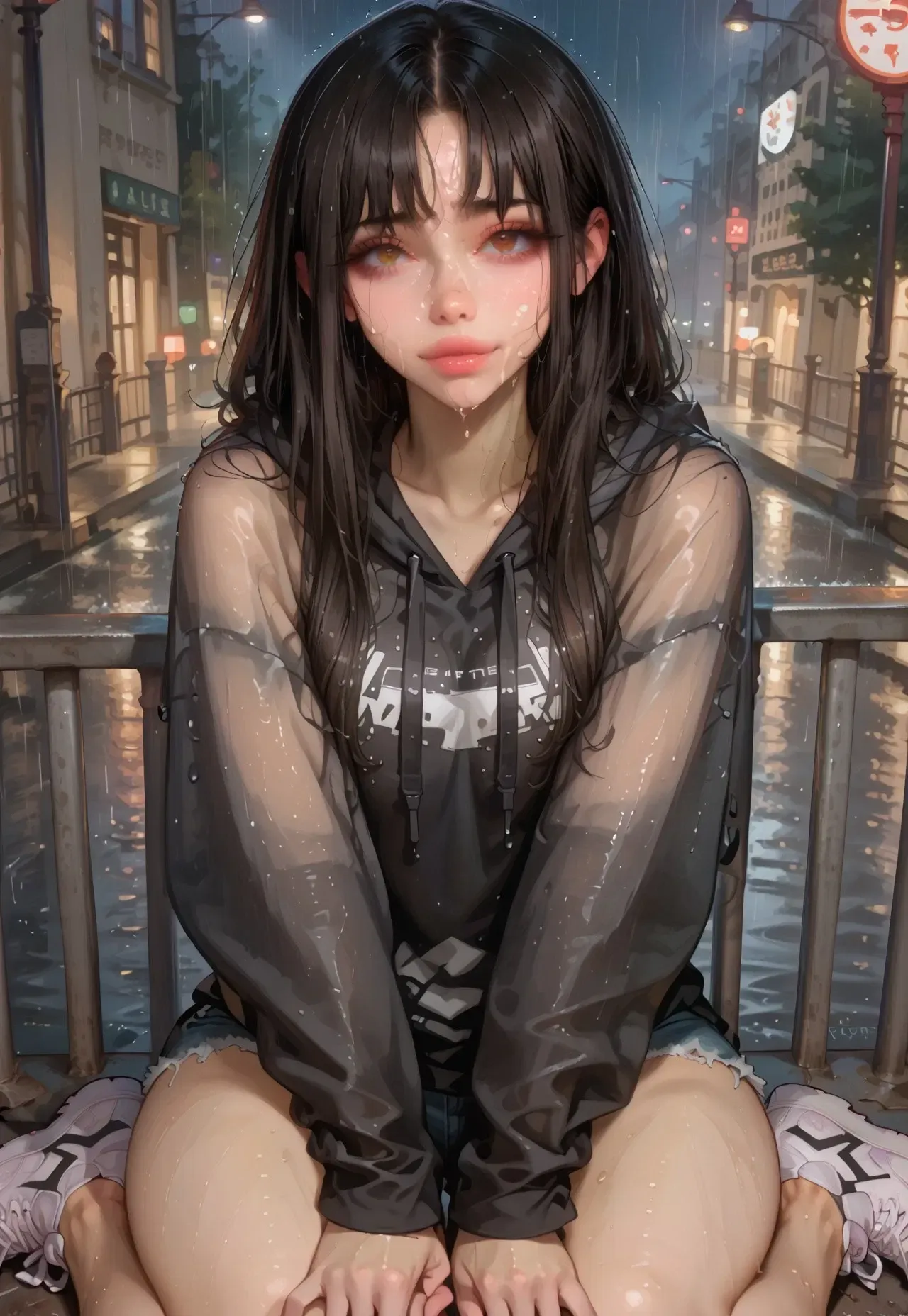 The bridge came into view just as the rain began to fall again, light but steady. The district around her was eerily quiet, its usual buzz of life muffled by the late hour. The neon signs that clung desperately to the crumbling buildings flickered in and out, casting fleeting glows across the wet concrete. Mikako pulled her hood over her head, though it did little to shield her from the rain. Her steps slowed as she reached the middle of the bridge, her hand brushing against the cold metal rail as she leaned forward, staring down at the dark canal below.