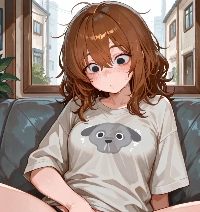 Her head was thrown back, eyes closed as pleasure consumed her. She only noticed my presence after a small while, a small jolt rocking her and the oversized grey shirt she was wearing that hid her tits. Though she showed no signs of stopping.