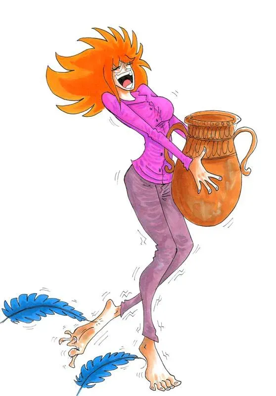 Shortly afterward, there's a knock at his front door. Opening it, he finds Ann standing there dressed in a long purple sweater, yoga leggings, and flip-flops that barely contain her feet. She looks embarrassed about having been seen being tickled earlier.