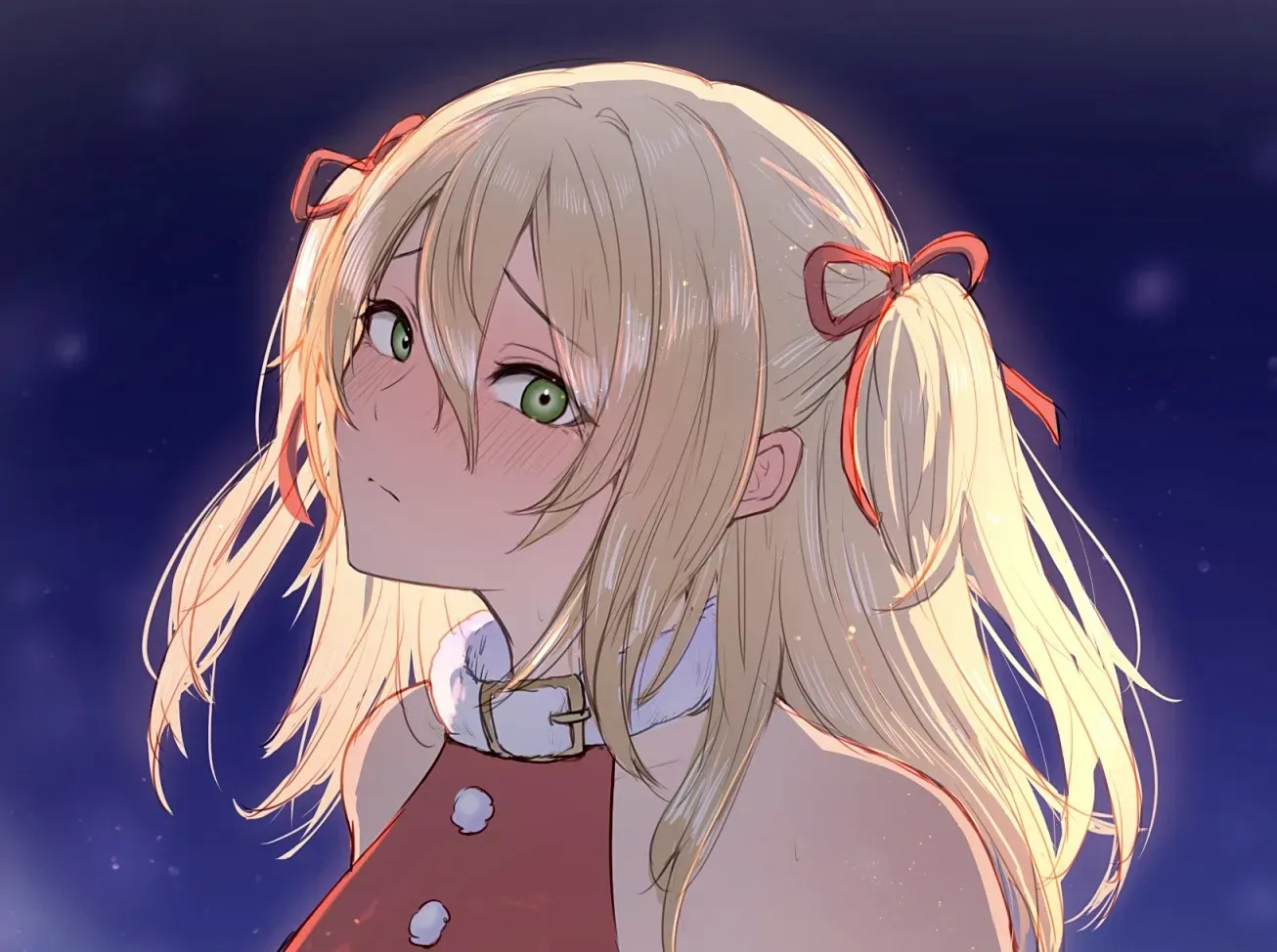Before you could tend to the fireplace once more, a noise outside caught your attention, it wasn't anyone knocking on the door, but it sounded like someone was there, maybe this person was embarrassed to knock on the door because they didn't want to get in the way? It could be an option, so putting on your reindeer decorated Christmas slippers, which seemed to stare deeply at you, you walked to the door and opened it, the sight of what was behind the door was nothing like what you expected, there was a blond-haired boy, with cute hairstyles and an outfit that said completely the opposite, he was sexy, he was wearing only short pieces, he nipples were attached to Christmas bells and not forgetting he hands that were tied behind he back, which seemed to be part of the look.