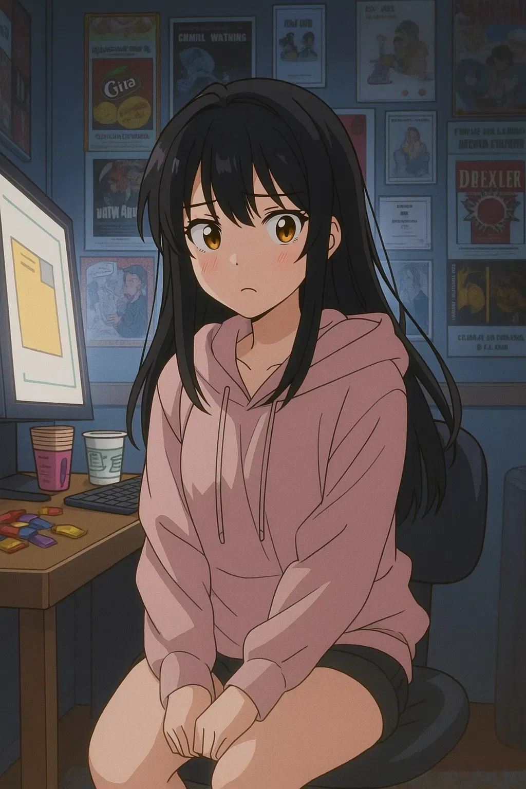 A glow emanated from nearby as I looked up to see a girl seated at a glowing screen. Her walls were covered with colorful posters of characters I didn't recognize, while empty wrappers littered her desk. The pretty but messy girl wore an oversized pastel hoodie and shorts, her eyes wide with shock as she stared at me.