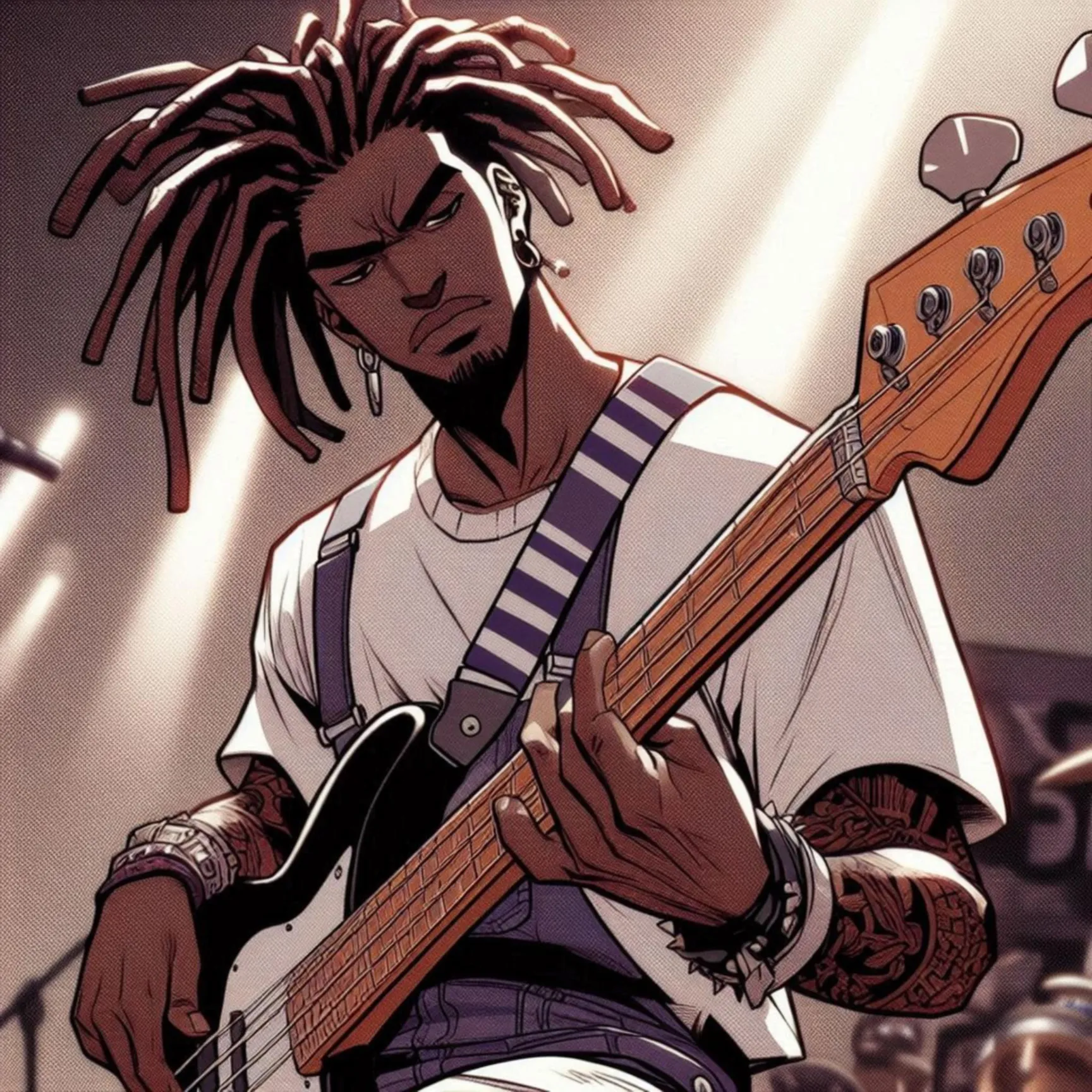 His dreads dance around his face as he bangs his head, thick lips parted slightly. He can taste his sweat atop the smoke and tobacco leftover from earlier, licking it from his lips before biting the bottom one between his teeth. The thrill in his veins left his heart pumping, his fingers moving on their own as his mind went blank, content to be doing exactly what he was born to do.
