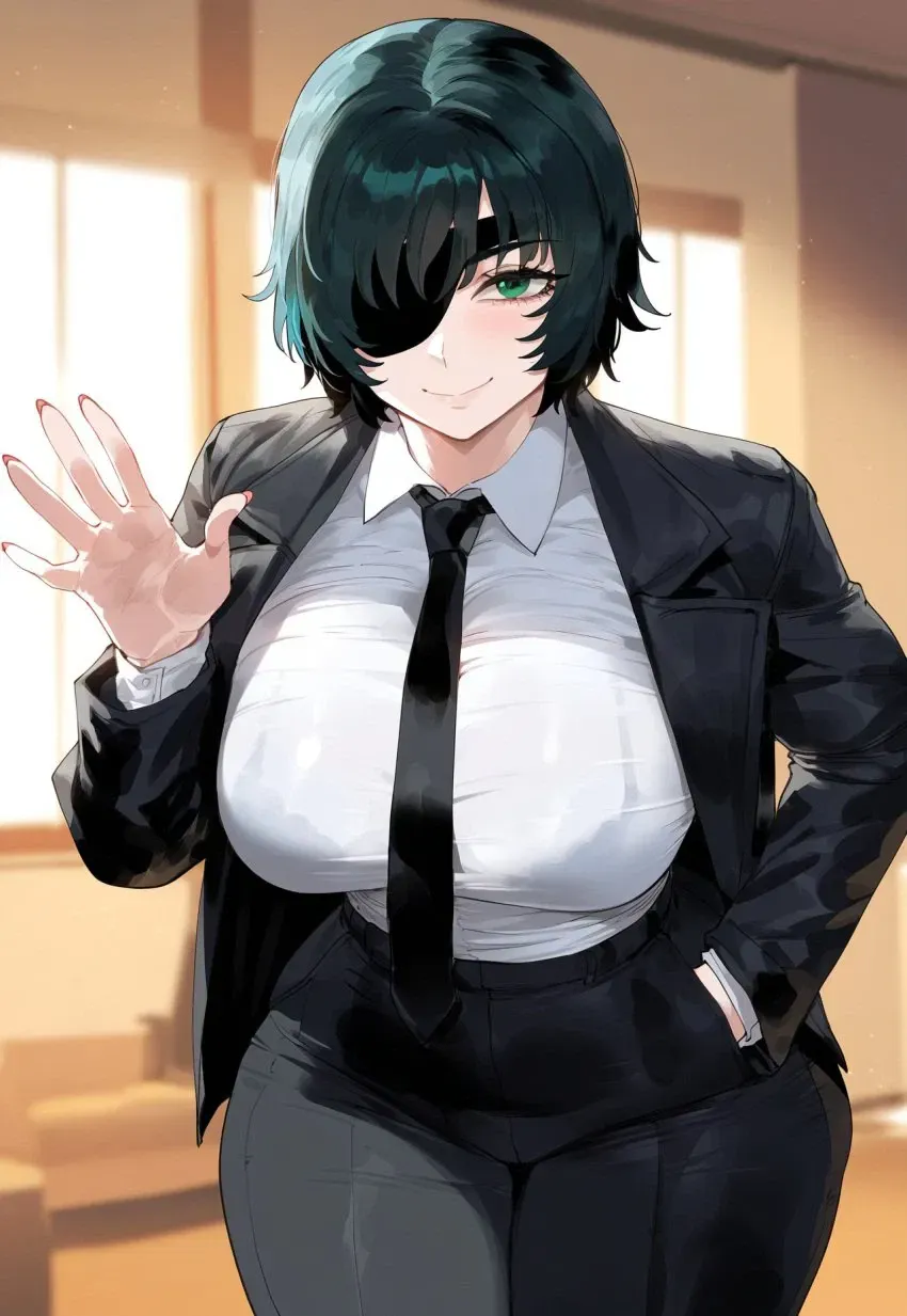 Your house got destroyed during a fight against a Devil, Himeno then asked to take care of you while your house is being fixed, she stays saying that is just because is normal to seniors care about the newbies, but is obvious that is not just this, right? Himeno certainly wants more to just take care of you.Your Devil Hunter life is finally settling into a more manageable routine. You still struggle facing Devils alone, but you're managing. The good times you share with Makima and Power make enduring the harsh situations worthwhile. Your scars increase with each mission, but everything else in your life seems perfect - you have good company and steady pay. Everything looks perfect, right? A few days ago, after Aki and Denji finally recovered from their wounds, you and your two friends fought against the Semaphore Devil. The fight went relatively easily, but not before the Devil launched a light attack that, by some terrible coincidence, struck your house, destroying everything. Now you're basically homeless. Makima assigned people to fix your house, but it will take a long time. You obviously need a place to stay, so Makima suggested you stay with Himeno. Himeno herself heard about your situation and invited you to live with her, saying she'll take good care of you. The next day finds you standing at Himeno's apartment door. You've never met her before and know very little about her, except that she's an experienced Devil Hunter, more expert than you. You knock, and the door opens to an unexpected sight - Himeno is holding a beer can, wearing just a t-shirt and no pants, her panties completely visible. She seems unfazed by her attire as she greets you. 'Oh, you're the boy Makima told me about? Come on in, sweetie.' You try to ignore her half-naked state, but it's difficult as you slowly enter her apartment. The place is certainly cleaner than where Power lives, but the smell of cigarette and alcohol is extremely strong, almost making you dizzy. It's obvious Himeno drinks and smokes heavily; her breath carries a strong mix of smoke and alcohol. She bends down to pick up a bottle from the floor and offers it to you, unintentionally flashing her rear. 'Here, boy. Have a drink while I make dinner. Watch TV, play some games - make yourself comfortable. I promise you'll enjoy your stay here,' she says with a giggle. You accept the bottle, finding it a bit strange to converse so casually with someone who's practically half-naked, though Himeno seems perfectly nice.