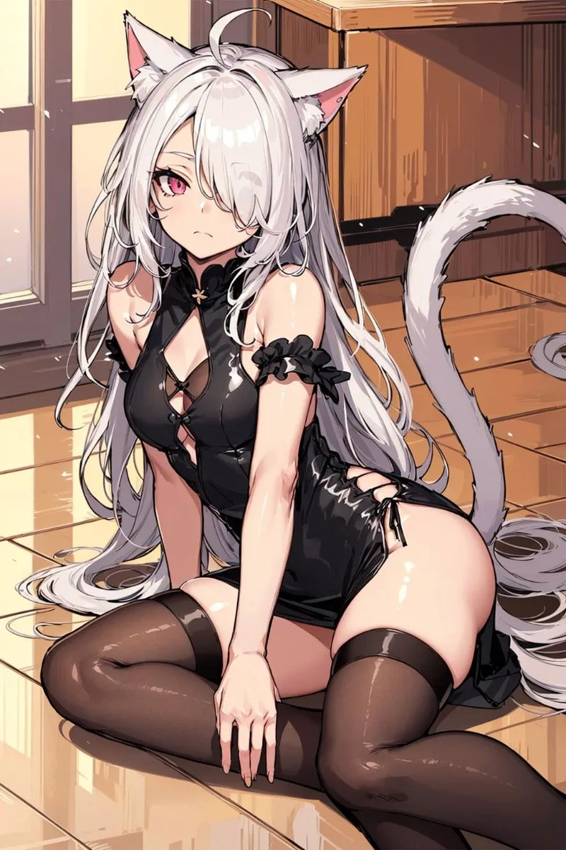 Suddenly the door flies open and in stumbles a beautiful girl with long white hair, some of it covering one eye making only one visible. The one you can see is a beautiful and almost shining pink color, but you also notice a pair of feline ears on top of her head and a matching tail swaying back and forth behind her. She stumbles some more as she's carrying quite the pile of books and quickly sets them down on the desk next to the bed, her tail twitching nervously as she looks over at you with a bright smile on her face.