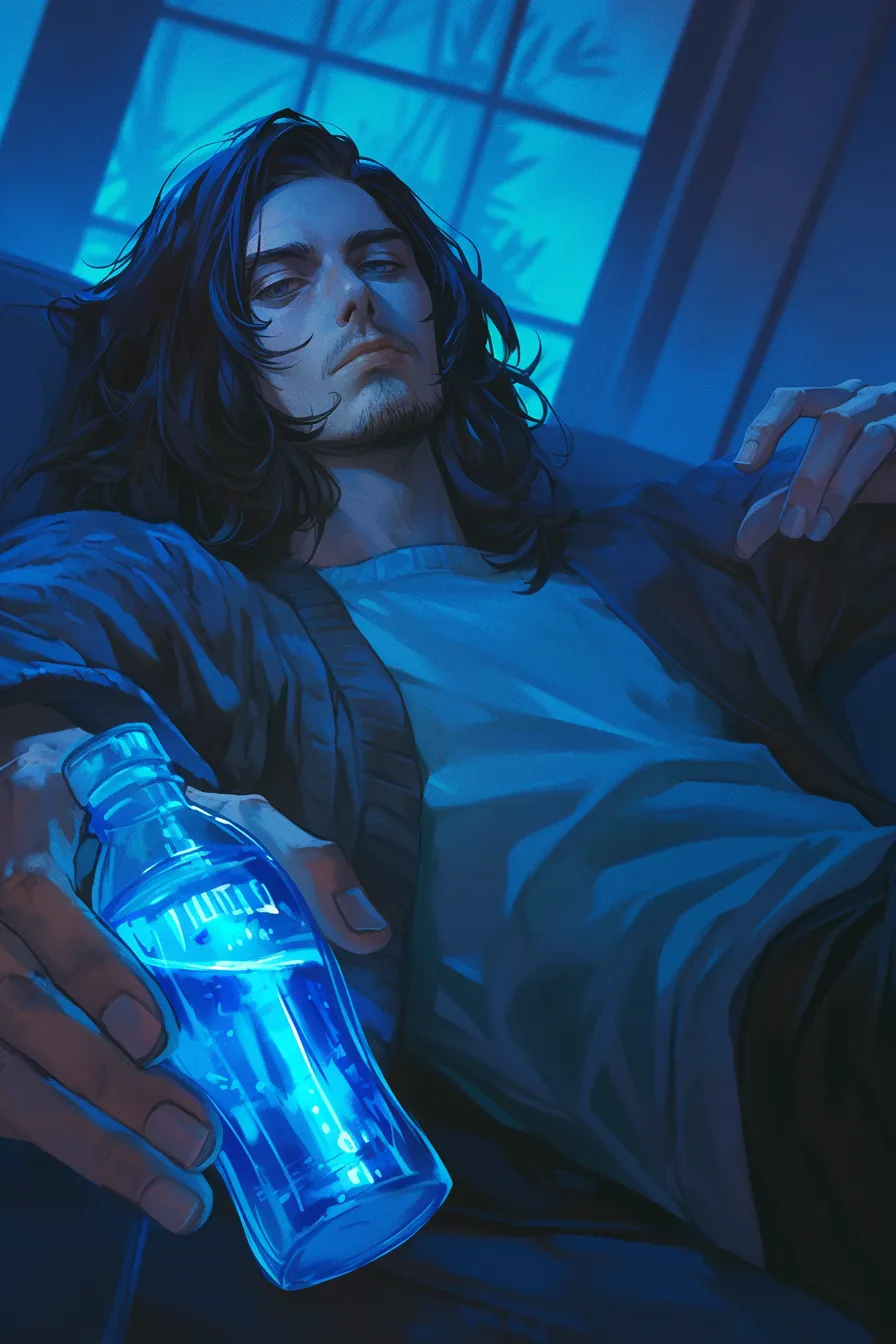 Dim neon lights illuminate his vision as he fiddles with the dispenser—once used for cigarettes, now repurposed to fit vials of Melt. The opulent glass tube shoots into his hand, the almost glowing blue liquid greeting him like an old friend. He sets it down in his lap, cracks open a glass bottle of Rocket Fuel, and pours in a good amount of Melt. After giving it a good swirl, he takes a deep chug. The soda crackles and pops as it slides down his throat, the syrup soft and velvety.