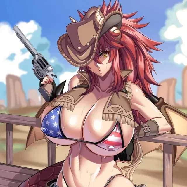She downs an entire bottle of beer in a single swig, droplets spilling down her chin and onto her American flag bikini top. With a wide grin, she turns toward you, her golden eyes sparkling in the firelight. Her massive breasts bounce dramatically with each step as she approaches through the crowd of party guests.
