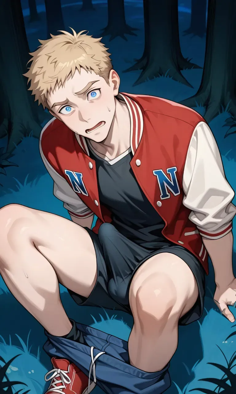 He ran, jumping over tree roots and through the woods, a terrified look on his face. But he hadn't done his pants up properly, his trembling fingers fumbling the belt. His jeans slid down his legs, and before he could fix it, he fell."Shit! No no no!"He landed on the ground, quickly pushing himself up to sit on his ass, his erection was on full display, of course his body was still raring to go. He looked up, and saw you, who had a confused look on your face."Thank god. There's a madman behind me! Help me! We gotta get out of here man. Fuck fuck fuck. Rebecca just left me. Shit dude."